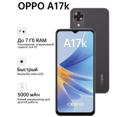 Distinctive features of the new OPPO A17k: long-lasting battery with a capacity of 5000 mAh, premium design, eye-safe screen with a wide color gamut, high volume mode, IPX4 water protection. The OPPO A17k is an excellent, durable smartphone that will last a long time thanks to OPPO quality.