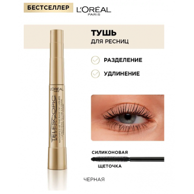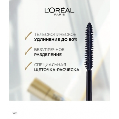The legendary TELESCOPIC mascara from L'Oreal Paris changes the idea of length. Telescopic mascara is No. 1 among lengthening mascaras in Russia. The silicone comb-brush separates and lengthens eyelashes by up to 60%. The black and extra black formula delivers unprecedented black and jet black coverage, respectively. The formulas of L'Oreal Paris TELESCOPIC mascara include BEE WAX, whose molecules add volume and plasticity to eyelashes, and CARNAUBA WAX strengthens eyelashes and increases the durability of the mascara. Mascara gives eyelashes a rich deep black or extra black color depending on the shade. Telescopic lengthening and separation of your eyelashes. Conquer any height with your gaze, because you deserve it! HOW TO USE: Using special zigzag movements, apply mascara to the eyelashes, moving from the base to the tips of the eyelashes, gently stretching them. Mascara can be applied in one or two layers to achieve the additional effect of incredibly long eyelashes.