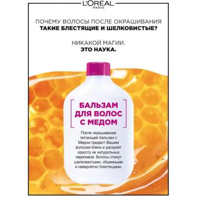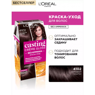 Hair coloring turns into a real care procedure, comparable to hair improvement in a beauty salon. The unique composition of permanent hair dye CASTING CREME GLOSS from L'Oreal Paris (Loreal Paris) without ammonia during coloring protects the hair structure from damage, while simultaneously caring for and smoothing it along its entire length. You can preserve and enhance the effect of silky shiny hair after coloring by using the New Hair Balm with Honey, which gives your hair softness, shine and silkiness. The package includes: ammonia-free coloring cream (48ml), a tube of developing milk (72ml), a bottle of hair balm with Honey (60ml), a pair of gloves, instructions for use. Casting Creme Gloss hair dye from L'Oreal is easy to use, thanks to the presence of a special applicator bottle, applying the dye becomes precise and simple. Full information about the staining procedure is contained in the instructions. Seductive color and shine. Long lasting color. Coloring gray hair. Takes care of hair during coloring. No ammonia.