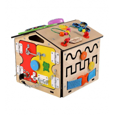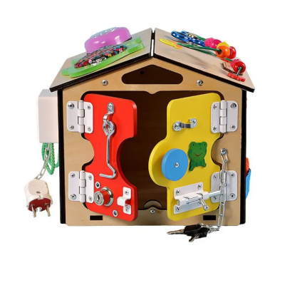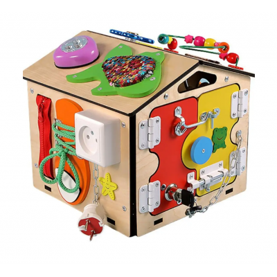Busy board is a gift toy for the early development of children. A business board with light is an educational play center. A bizidom or busy board house for boys and girls is designed to develop motor skills, logic, thinking, and teach household skills. Set of games: doors, hook, handle, latch, built-in lock with key, zipper, lacing, plastic fastener, wave labyrinth, square labyrinth, wooden spinner, lamp (batteries inserted), fish with iridescent sequins, abacus, socket with plug , roller wheel, spinning gears with beads inside, images of animals. The house has a floor, the surface is varnished and can be wiped with a damp cloth. The color of the elements (twist, zipper, laces) may differ from the sample. Composition: plywood, MDF. Attention - plywood has a heterogeneous structure, where lines are visually visible, inserts are NOT a defect, but features of wood and plywood production. Our other business boards with light, music, and a road business cube can be found by clicking on the KimToys logo