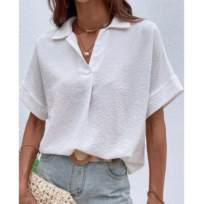 Summer women's blouse made of crinkled material, loose fit in boho style. A festive evening shirt will help you create a stylish look for the office and school, for graduation, graduation and New Year, and even for a wedding. A white women's blouse in a shirt style with short sleeves looks good under a jacket, trousers, skirt and jeans and shorts, as well as under a top as a cape. An office or school shirt in boho style will help create a strict, but at the same time stylish look. Thanks to the loose straight cut, it is also suitable for nursing mothers.